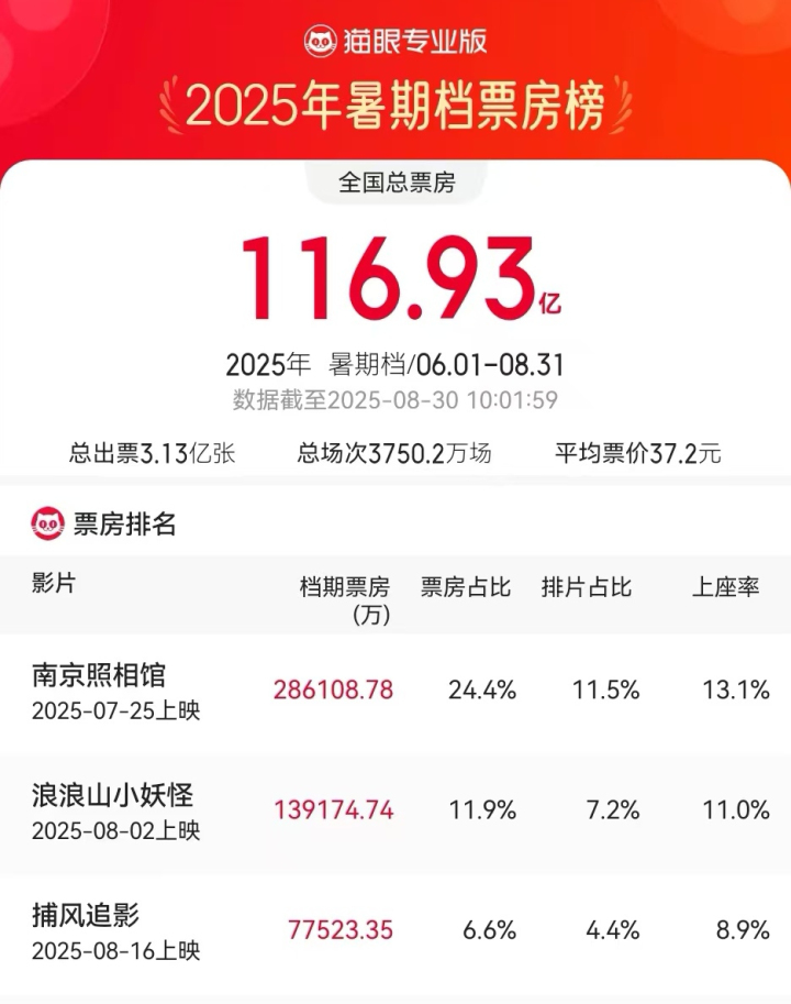 据央视新闻援引网络平台数据,截至8月29日,2025年暑期档电影总票房达到116.5亿元,超过2024年暑期档电影总票房。《南京照相馆》《浪浪山小妖怪》《捕风追影》分列暑期档票房榜前三位。